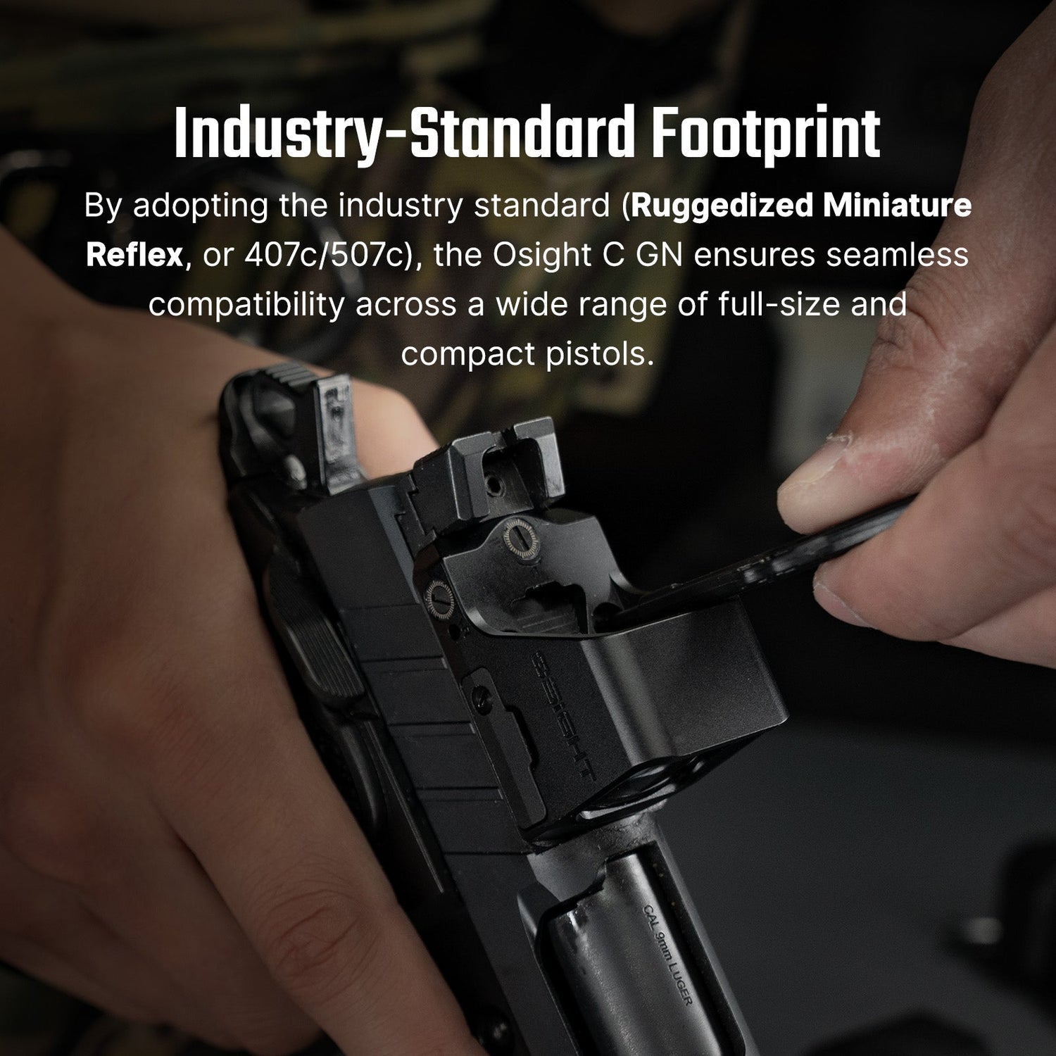 Osight C green on avoin pistoolin punapistetähtäin, joka on suunniteltu nopeaan maalin hankintaan ja helppoon jokapäiväiseen käyttöön. Se käyttää Trijicon RMR footprint -standardia, mikä tekee siitä yhteensopivan monien modernien pistoolien ja tähän teollisuusstandardiin perustuvien kiinnityslevyjen kanssa.